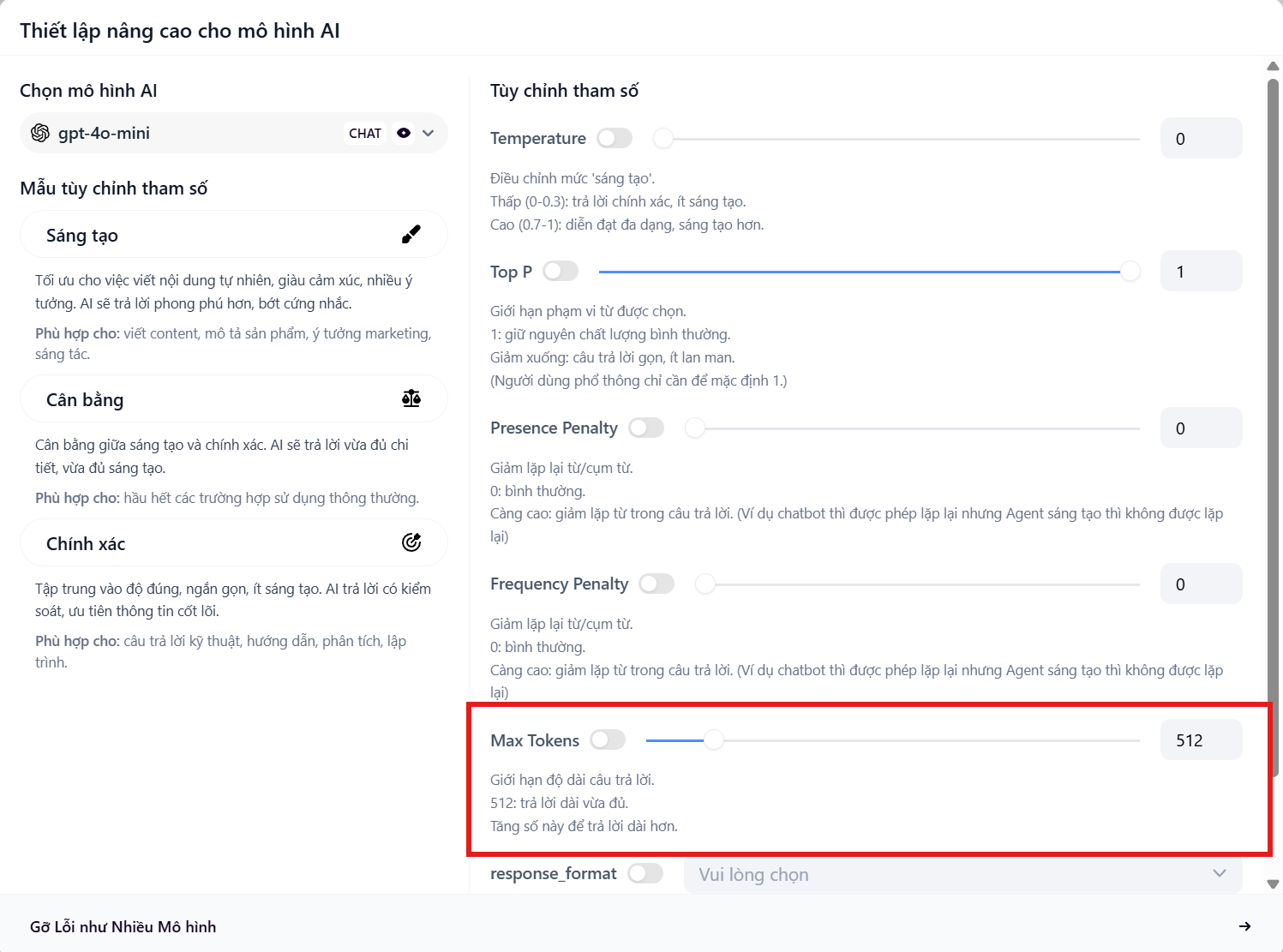 - Token tối đa (Max Tokens): Giới hạn độ dài câu trả lời của Bot.